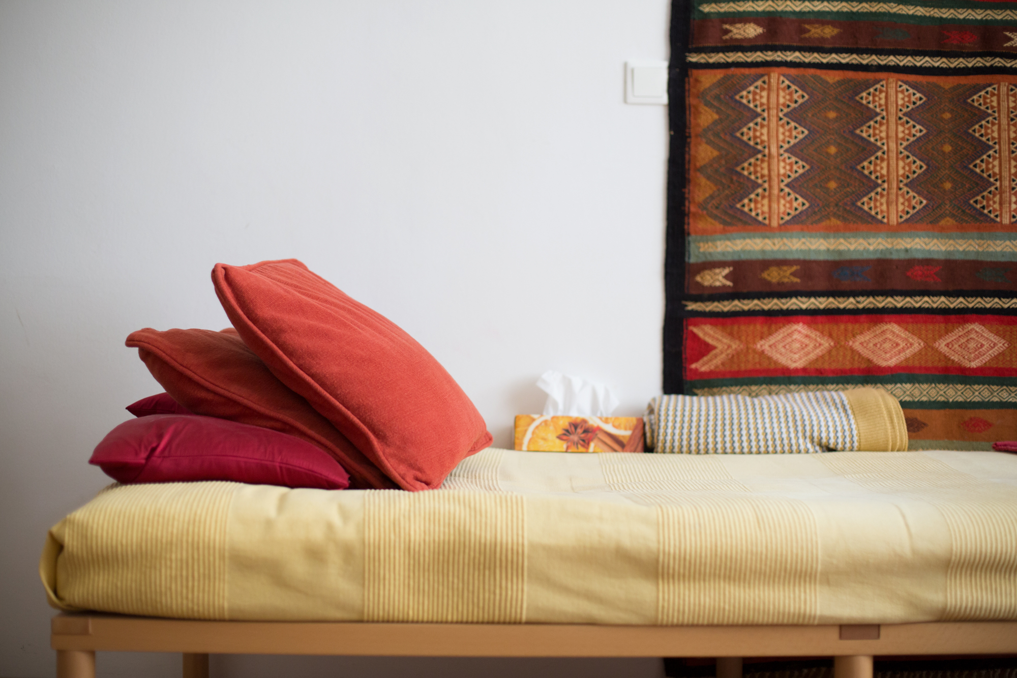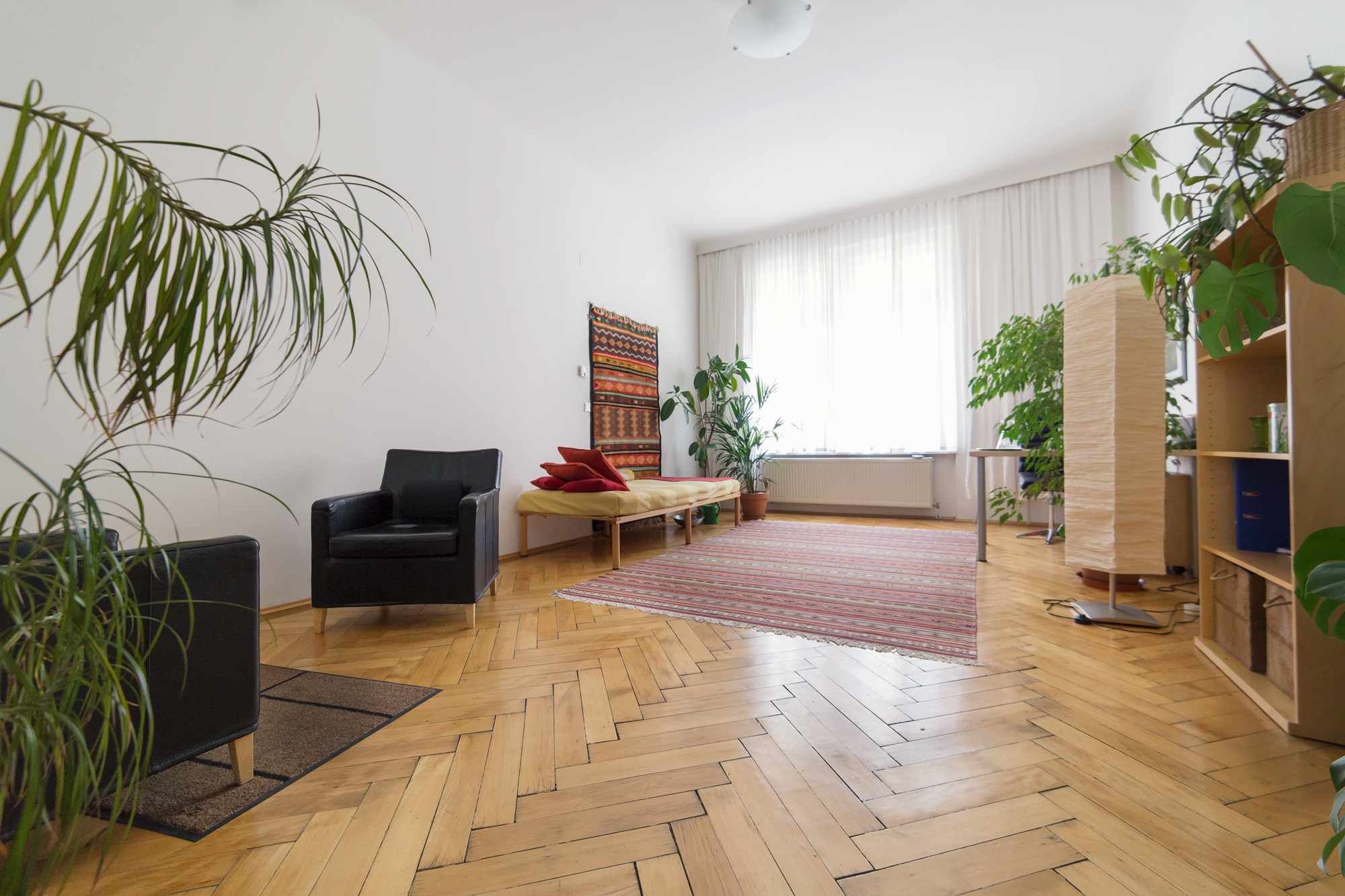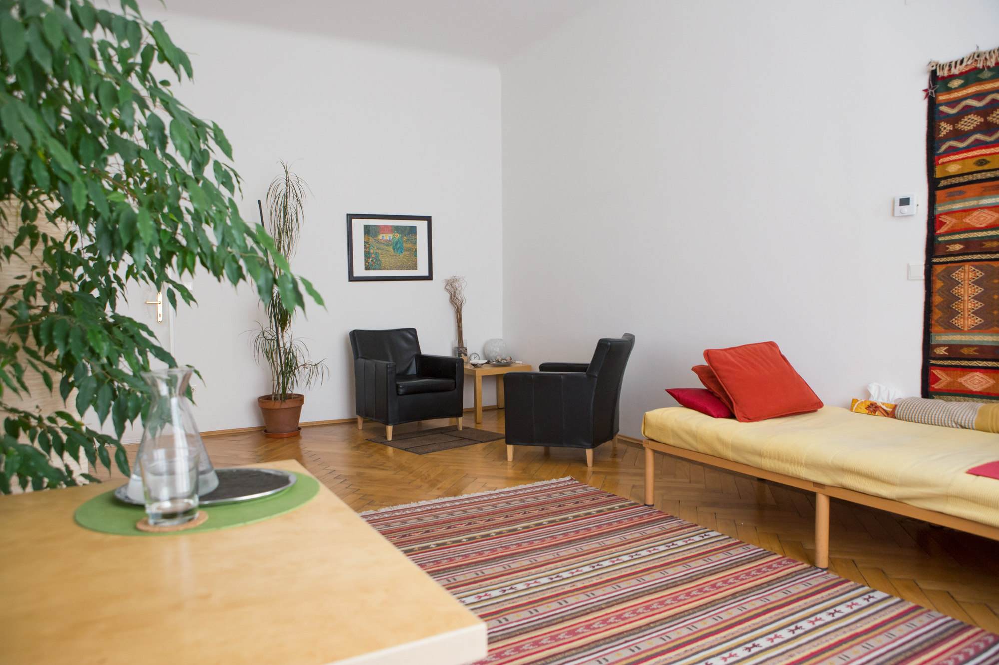 Die Praxis befindet sich in unmittelbarer Nähe der Mariahilferstrasse (Höhe Gerngross) in der Barnabitengasse - einer ruhigen Seitengasse gleich neben der Mariakirche. Durch den gut beleuchteten Flur kommen sie durch eine Sicherheitstür - entweder mittels Aufzug oder über die Treppe - direkt zum Praxisraum im zweiten Stock. In der Praxis haben sie die Möglichkeit, sich sowohl sitzend, als auch liegend ihren Themen zu widmen.
